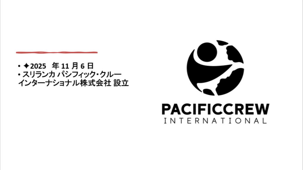 また、2025年 11 月 6 日にスリランカ にてパシフィック・クルーインターナショナル株式会社を設立しました。今後パシフィック・クルーインターナショナル株式会社についてもお知らせしていきます。