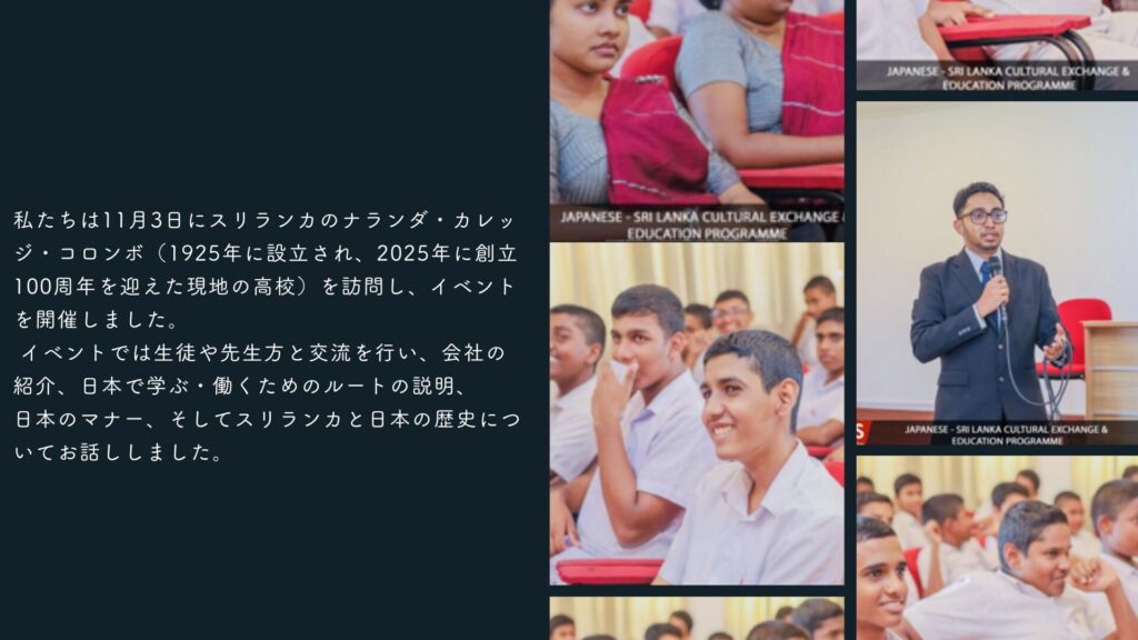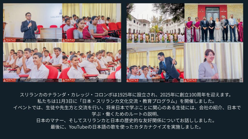 2025年11月にスリランカを訪問し、スリランカのナランダ・カレッジ、アソカ・カレッジ、ミライ日本語センター、カシコイ・ランゲージセンターなどでイベントを実施しました。