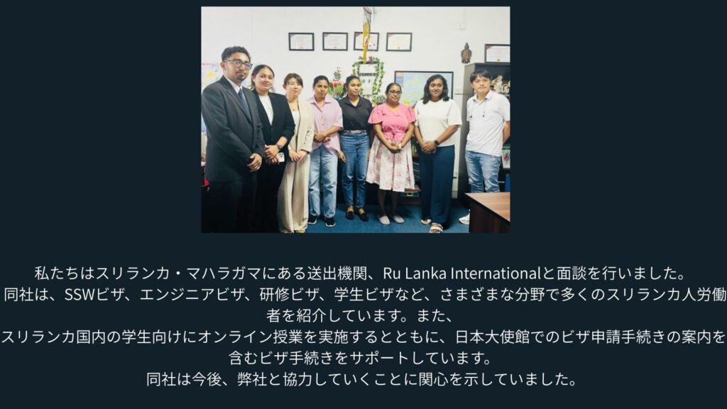 また、Ru Lanka International、コロンボ・アカデミー・オブ・ホスピタリティ・マネジメント、コロンボのロータリークラブの方々とも交流し、今後の協力提携と留学生や労働者へのサポートについて意見交換を行いました。